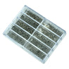 1000 stainless steel micro screws are offered. These screws are generally used for watch and eyeglass repair. Screws are separated by their sizes and conveniently stored in 10 compartments in one hard clear case.